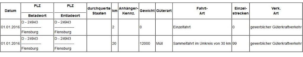 Sammelfahrten (z.B. Müll-Sammelfahrten), bei denen die einzelnen Beladestellen im Umkreis von 30 km liegen, können vereinfacht als eine Fahrt mit folgenden Angaben eingetragen werden: